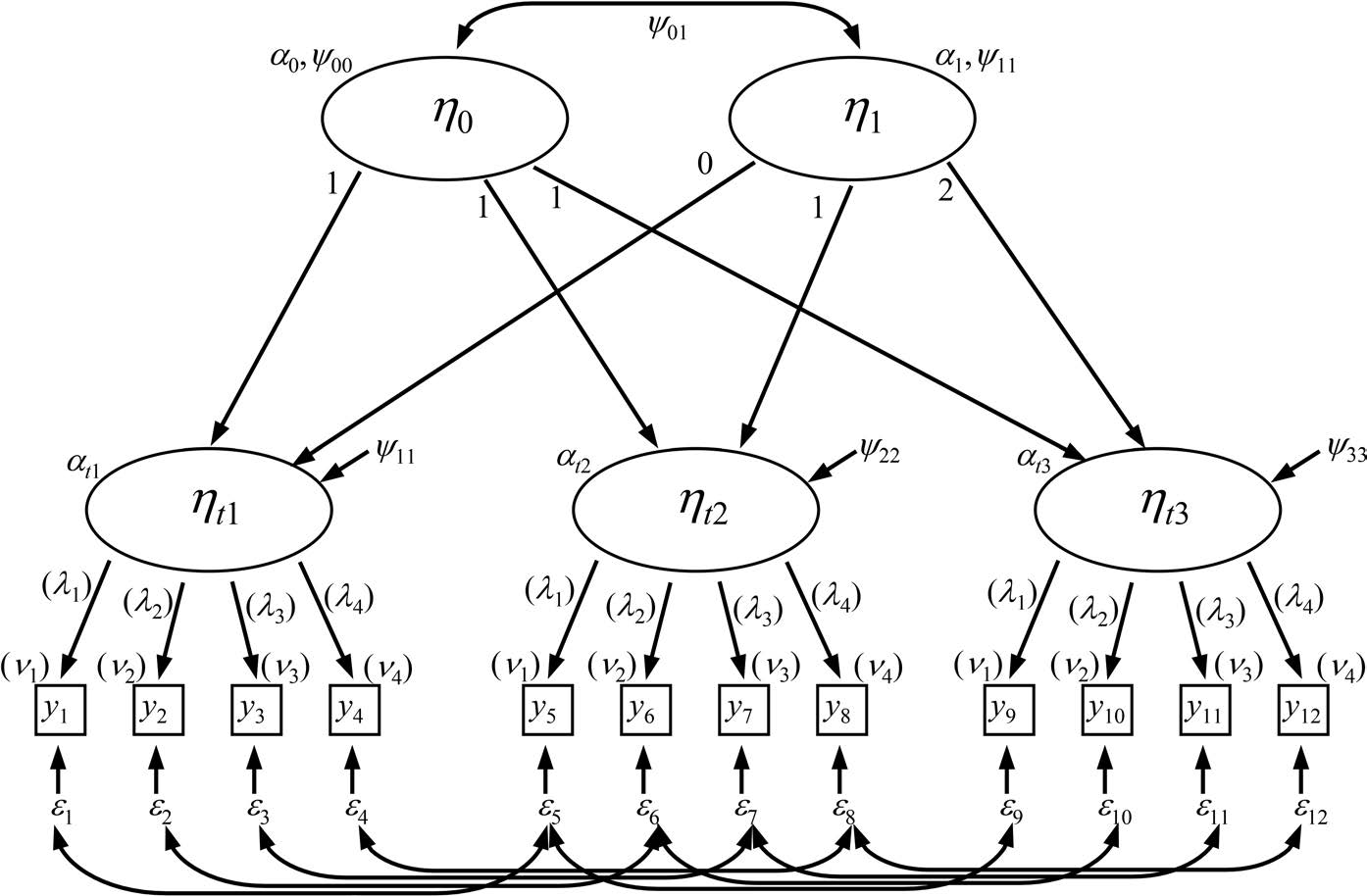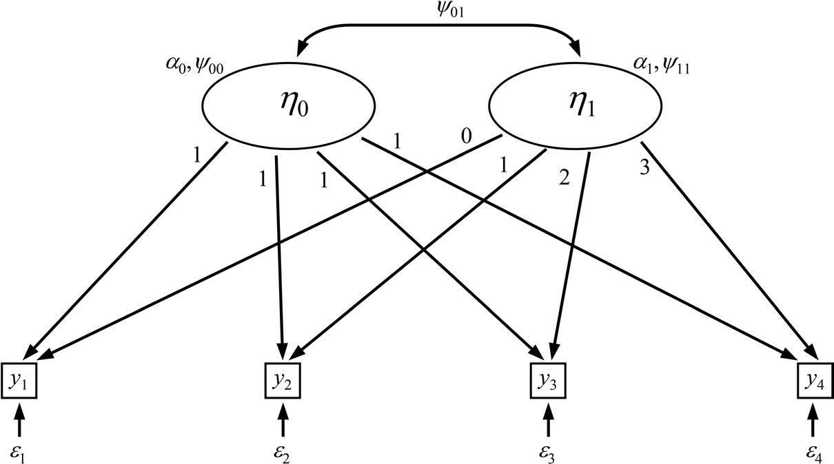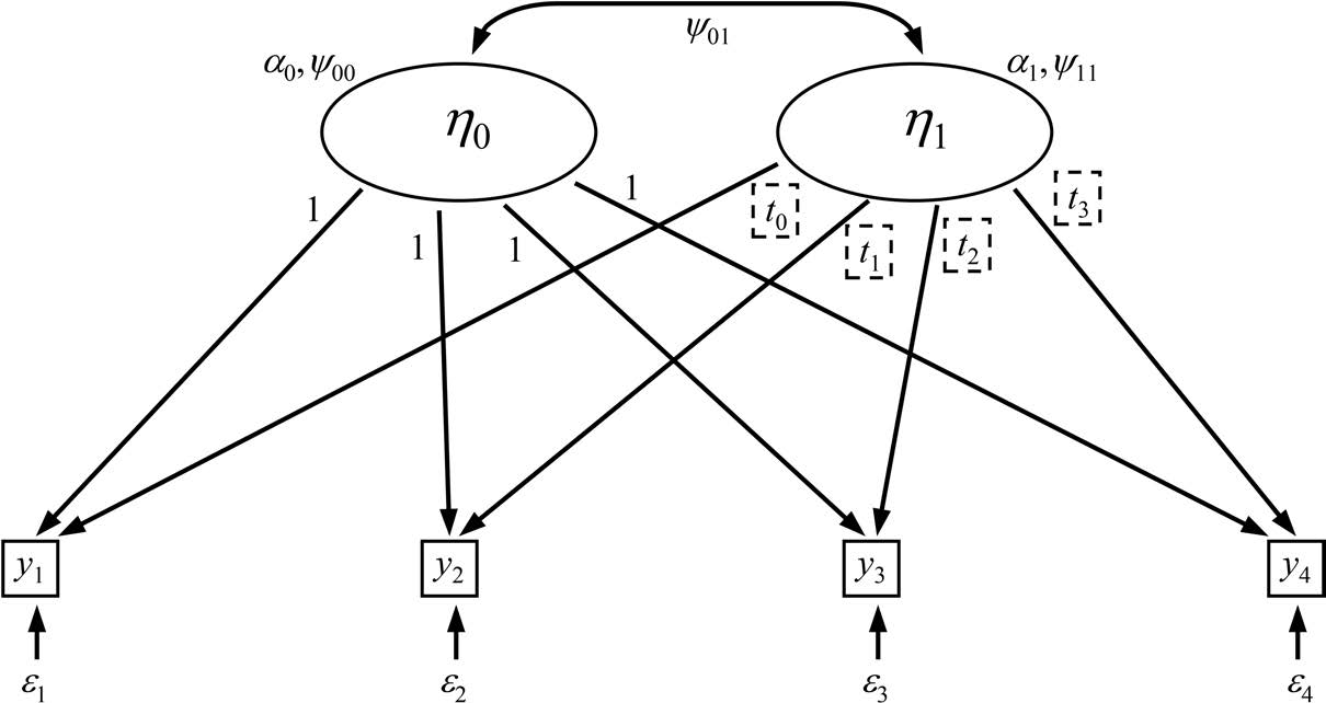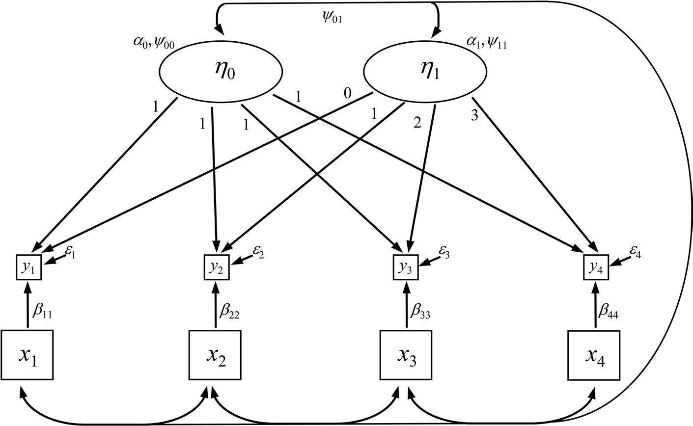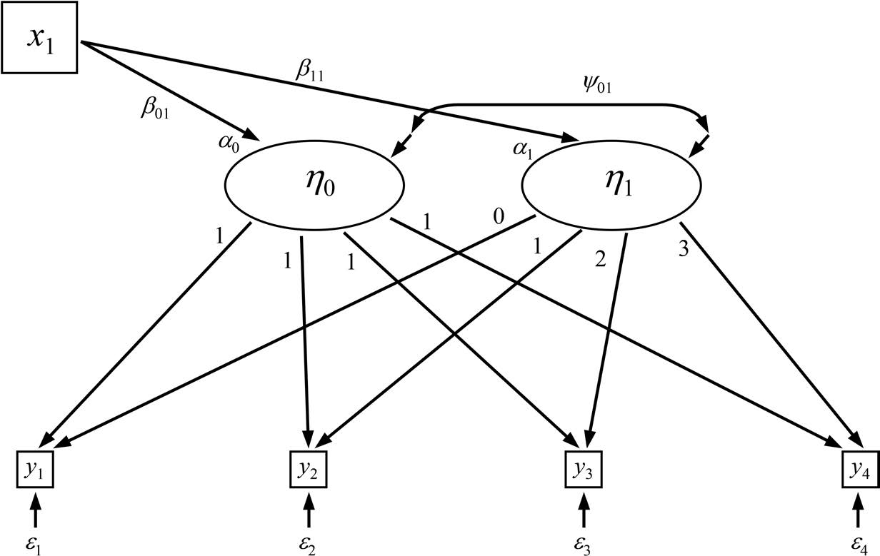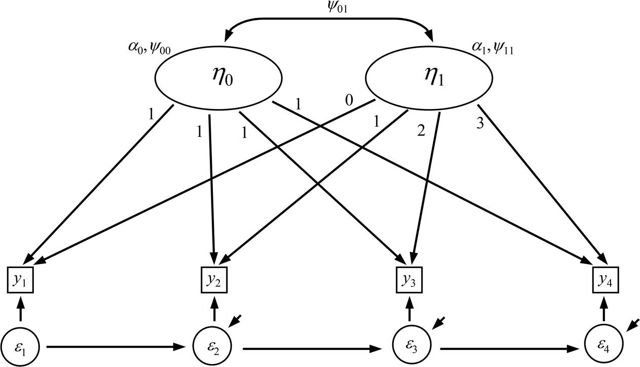 结构方程模型可通过在模型的测量部分施加特定约束,构建与多水平回归增长曲线分析中两组方程并行的方程组。案例层面的回归通过设定两个潜变量进行建模:一个潜变量 \eta_{0i} 代表截距,另一个潜变量 \eta_{1i} 代表斜率。