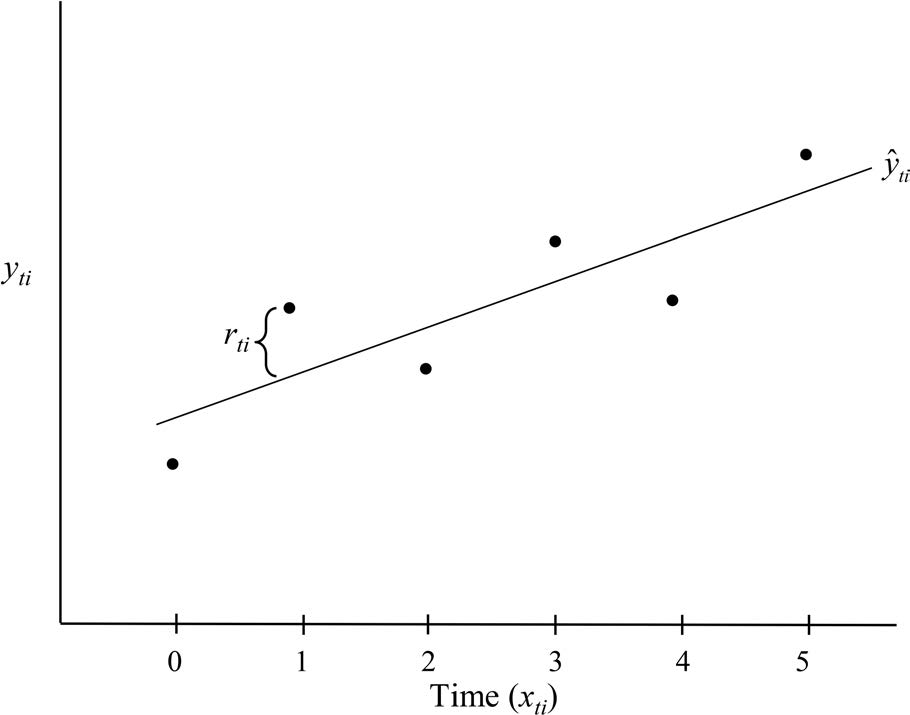 该最终方程可视为线性回归模型,其右侧前两项构成标准线性回归结构,其余项则代表三个误差分量,而非单一误差项。此即应用于纵向数据的多层回归模型,其中时间点嵌套于个案内。u_{0i} 表示任意个案截距值与样本平均截距的偏离程度,r_{ti} 残差的方差常被称为个体内变异,u_{0i} 残差的方差则反映个体间差异。u_{1i} 残差提供了个体变化差异的信息,即任意个案斜率与平均斜率的偏离程度。